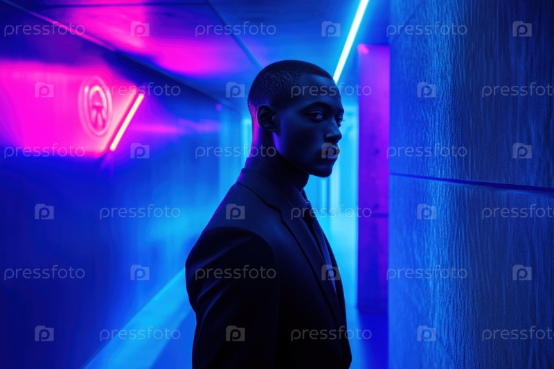 Стоящий в неоново освещенном коридоре с просмотром профиля