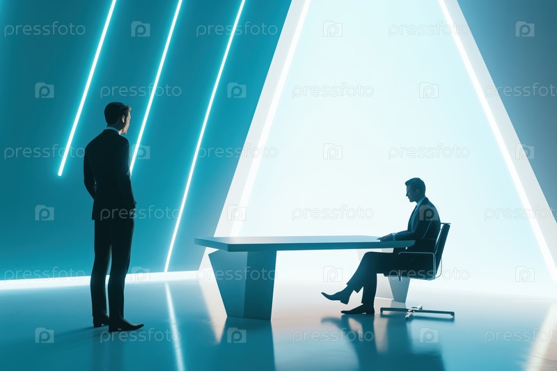 Бизнесмены встречаются в футуристической офисной обстановке