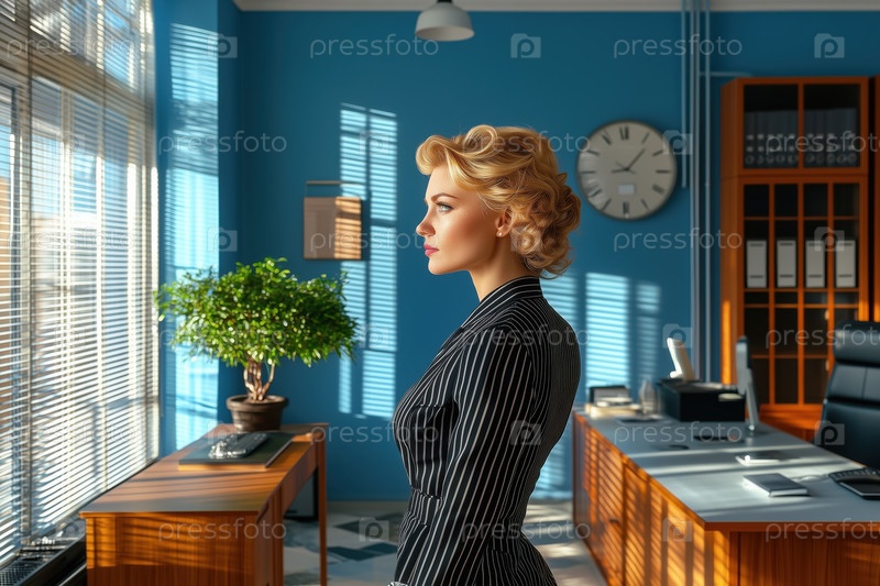 Деловая женщина, стоящая в офисе с голубыми стенами и часами