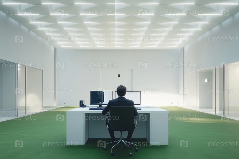 Человек, работающий за столом в современной офисной обстановке