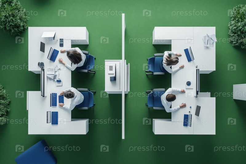 Общий вид офисных работников на столах, разделенных разделением