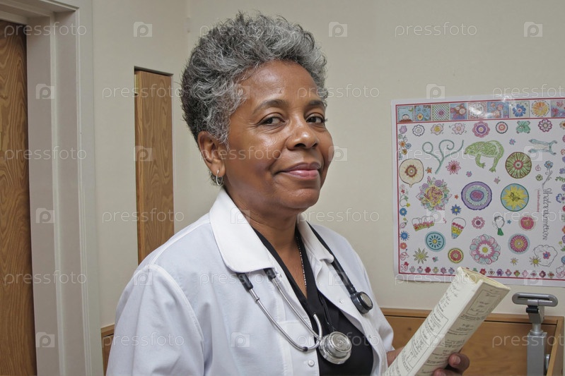 Портрет старшего чернокожего врача-женщины, улыбающегося в то время как он держит медицинскую карту