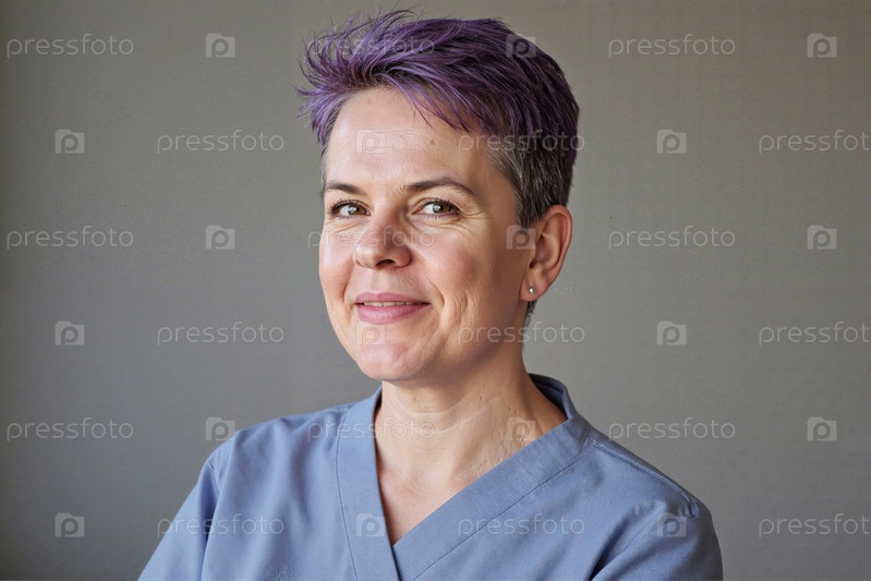 Портрет женщины среднего возраста Доктор улыбается и носит скрабы