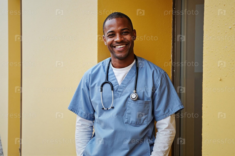 Портрет молодого взрослого чернокожего врача, улыбающегося уверенно в больнице