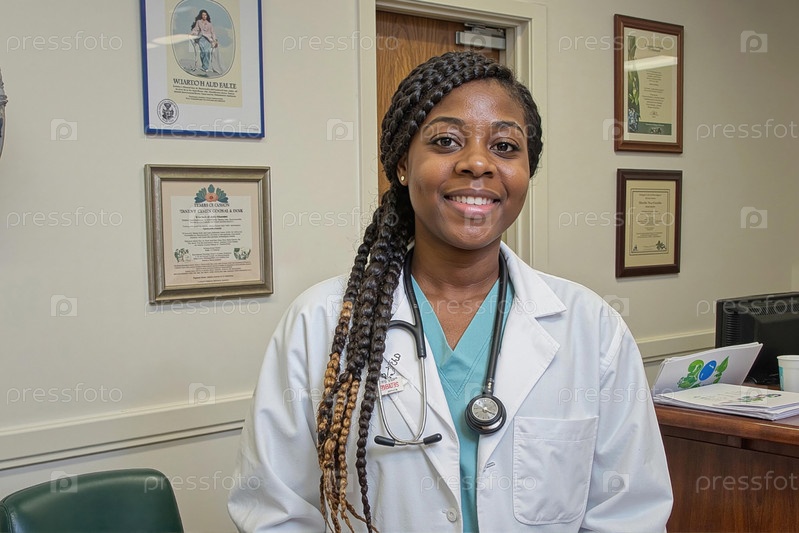 Портрет молодой взрослой чернокожей женщины-врача, улыбающейся в медицинском кабинете