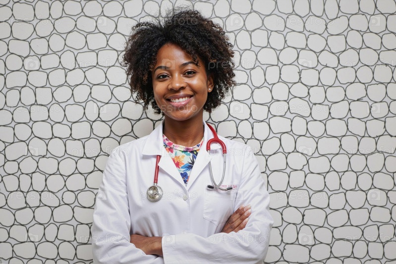 Портрет молодой взрослой чернокожей женщины-врача, улыбающейся с перекрещенными руками