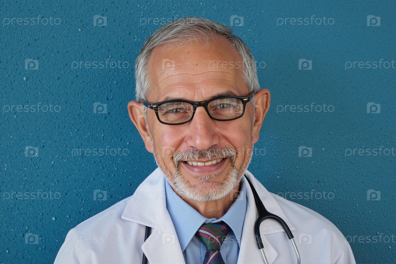 Портрет мужчины среднего возраста Доктор улыбается на синем фоне