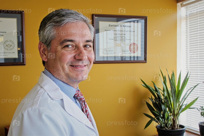 Портрет мужчины средних лет Доктор улыбается в медицинском кабинете