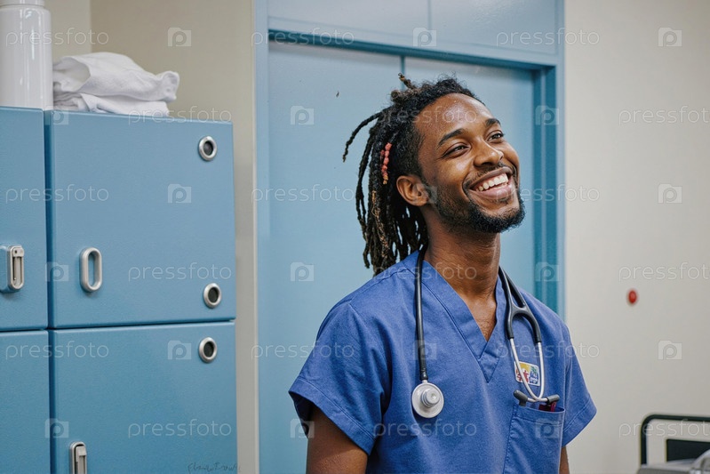 Портрет молодого взрослого чёрного мужчины, улыбающегося и уверенно носящего медицинские скрабы