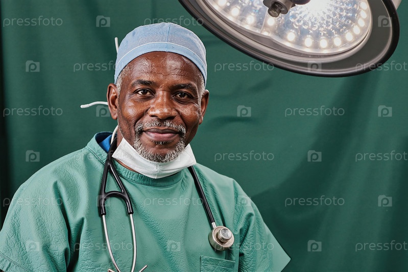 Портрет чернокожего доктора средних лет, улыбающегося в больничной операционной