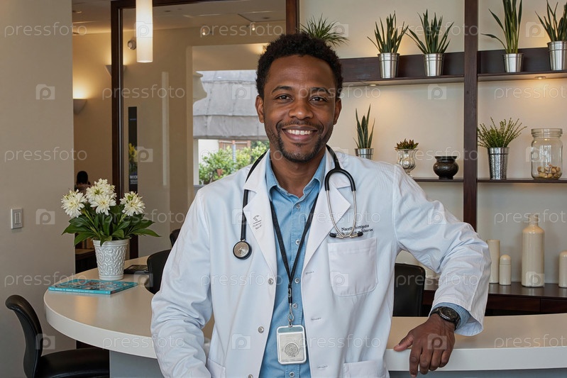 Портрет молодого взрослого чернокожего врача, улыбающегося уверенно в клинике