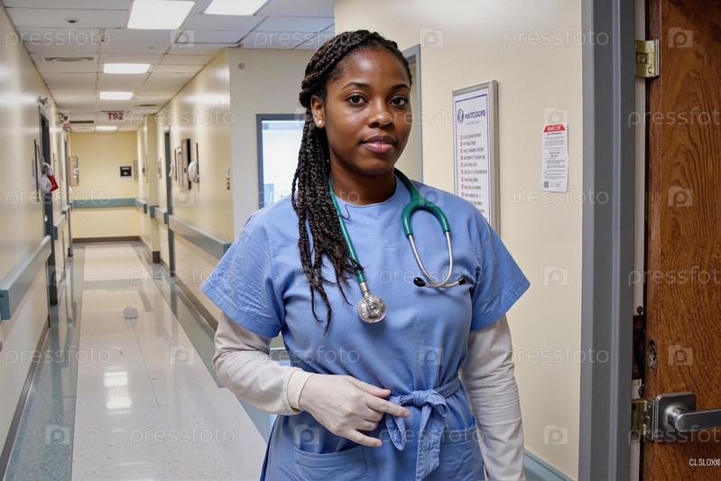 Портрет молодой взрослой чернокожей женщины-врача, уверенно стоящей в коридоре больницы