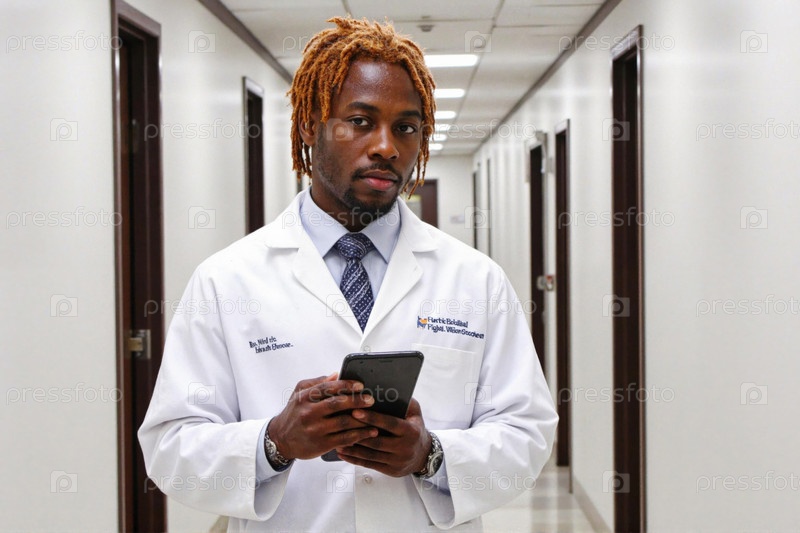 Портрет молодого взрослого чернокожего врача, стоящего в коридоре больницы с помощью планшета