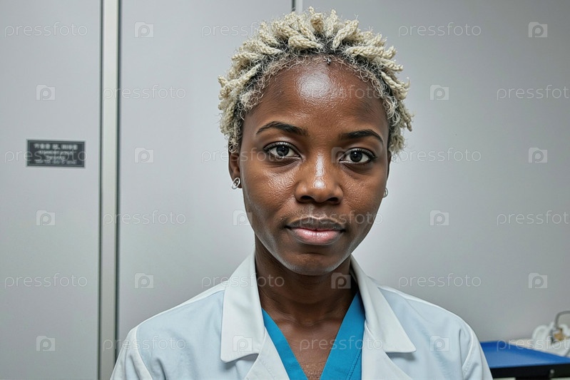 Портрет молодой взрослой чернокожей женщины-врача, стоящей в больничной комнате для обследования