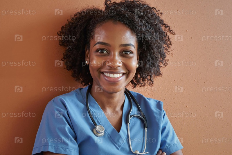 Портрет молодой взрослой чернокожей женщины-врача, улыбающейся уверенно перед камерой
