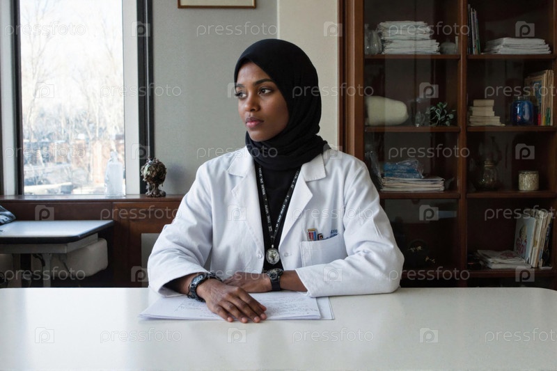 Портрет молодой взрослой чернокожей женщины-врача, сидящей за столом и носящей хиджаб