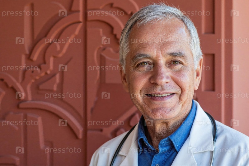 Портрет старшего врача, улыбающегося уверенно перед камерой