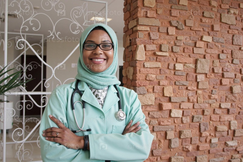 Портрет молодого взрослого мусульманского врача-женщины, улыбающегося и уверенно стоящего