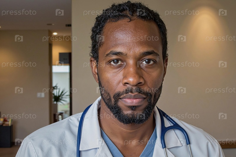 Портрет чернокожего врача среднего возраста, который серьезно смотрит на камеру в помещении