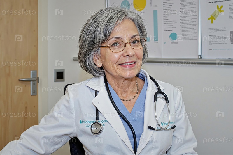 Портрет старшей женщины-врача, улыбающейся и сидящей в медицинском кабинете