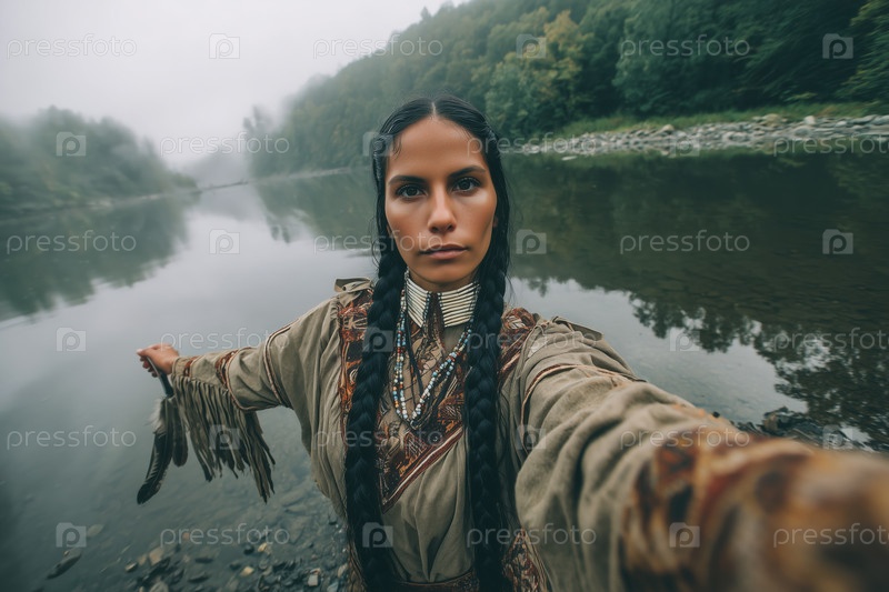 Портрет молодой взрослой коренной женщины, делающей селфи возле реки Форест