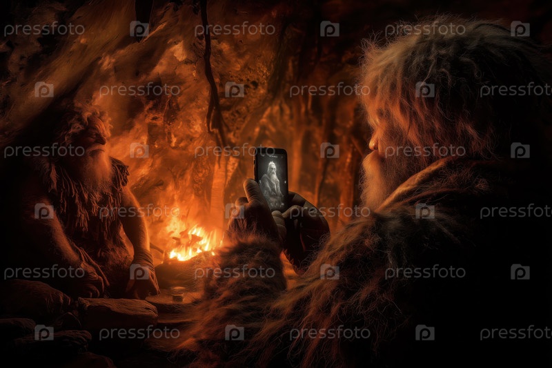 Мужчины среднего возраста сидят в пещере, используя смартфон возле огня
