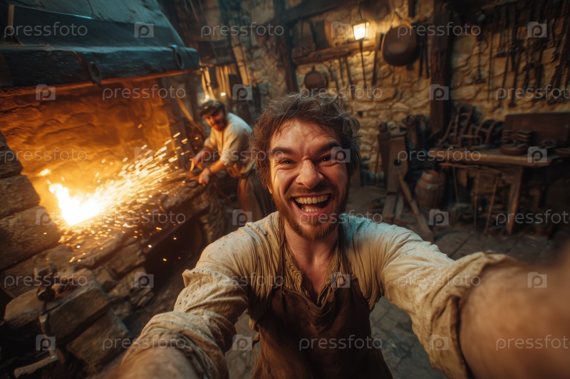 Портрет молодого человека, улыбающегося во время работы в традиционной кузнечной мастерской