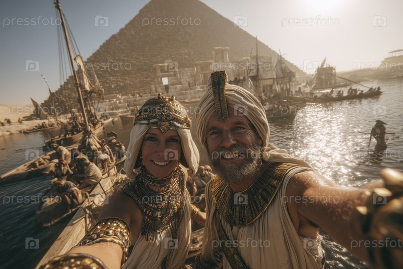 Мужчина и женщина средних лет делают селфи в Древнем Египте