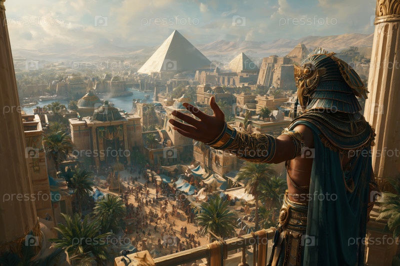Древнеегипетский фараон с видом на город с пирамидами и собирающиеся толпы