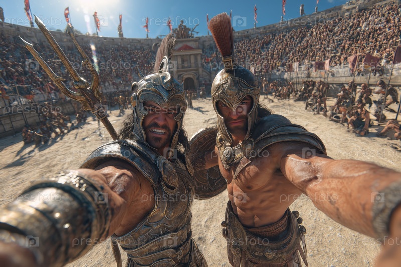 Два молодых взрослых мужчины, носящие доспехи, делают селфи на древней арене