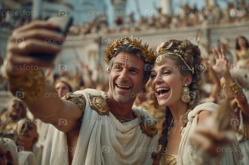 Молодой мужчина и женщина делают селфи во время Древнего римского фестиваля