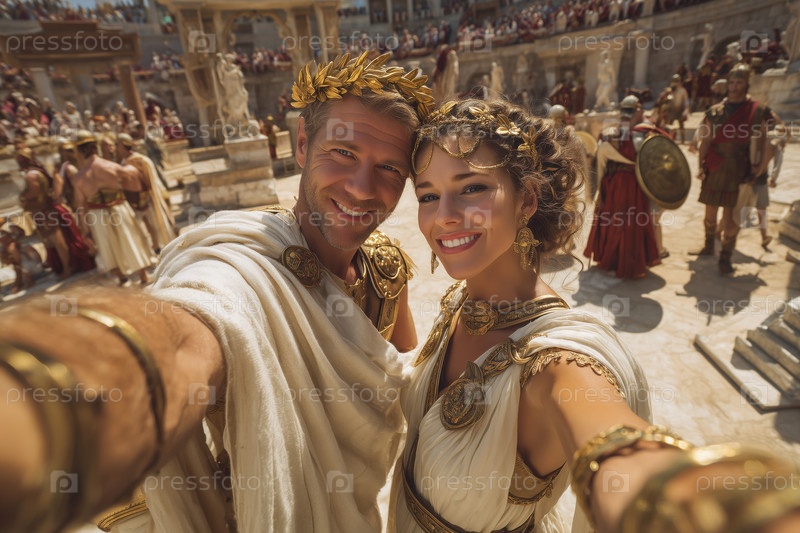 Портрет молодого человека и женщины, делающих селфи на древнеримской арене