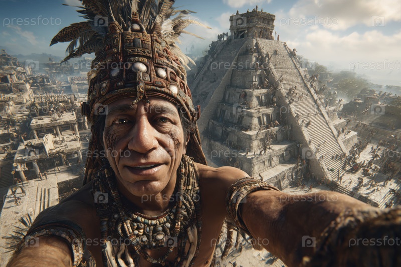 Портрет средневекового коренного человека, делающего селфи возле древней пирамиды