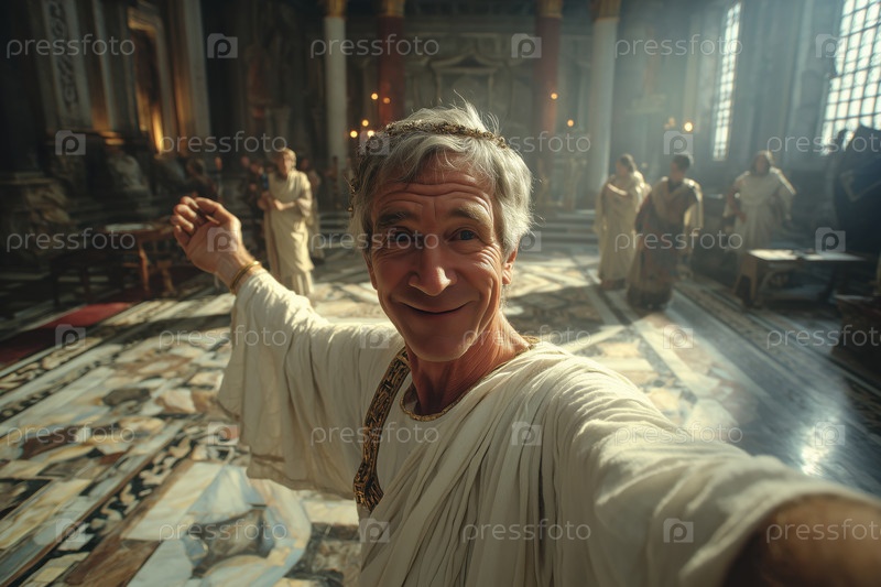 Портрет пожилого человека, делающего селфи в античной римской обстановке
