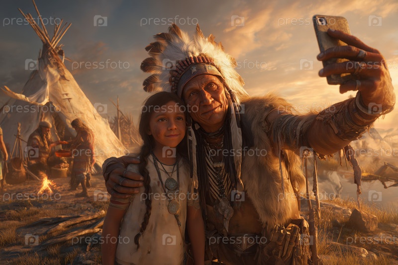 Коренный американский старший мужчина делает селфи с девочкой-ребенком на улице в закате