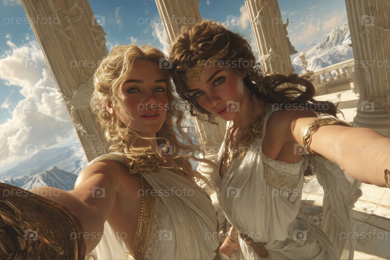 Портрет двух молодых взрослых женщин, делающих селфи в условиях древнего храма