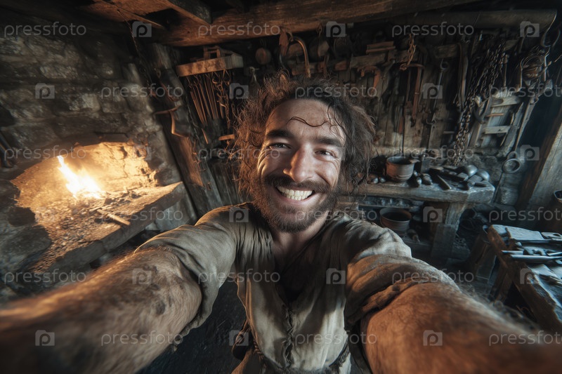 Портрет молодого взрослого мужчины, улыбающегося во время работы в мастерской кузнеца