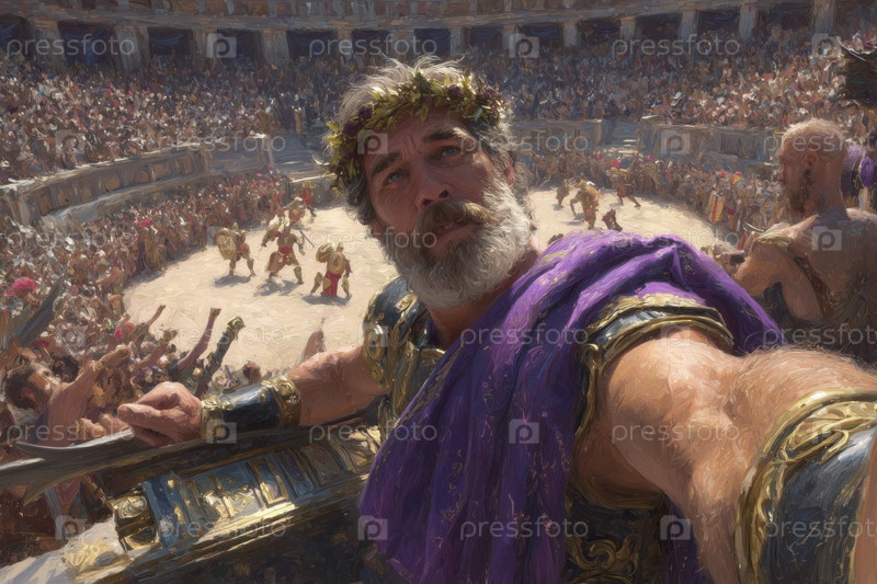 Портрет мужчины среднего возраста, делающего селфи на событии древней арены