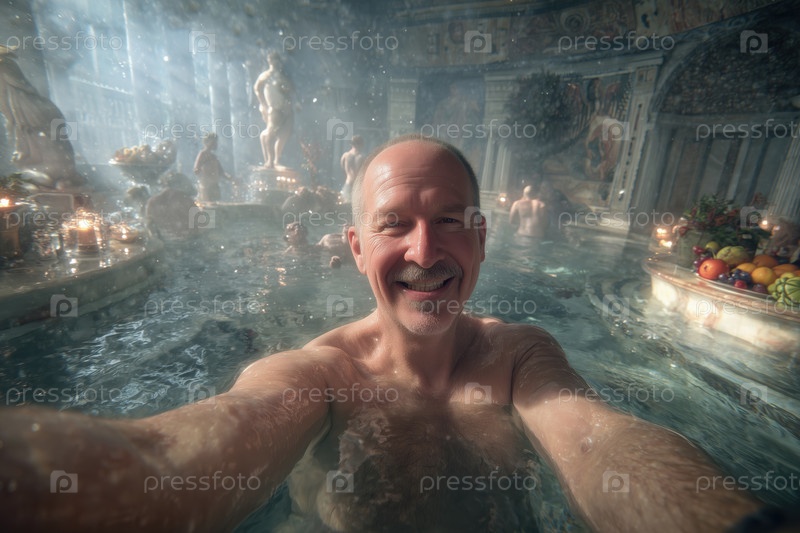 Портрет пожилого человека, улыбающегося во время фотосессии в роскошной ванне