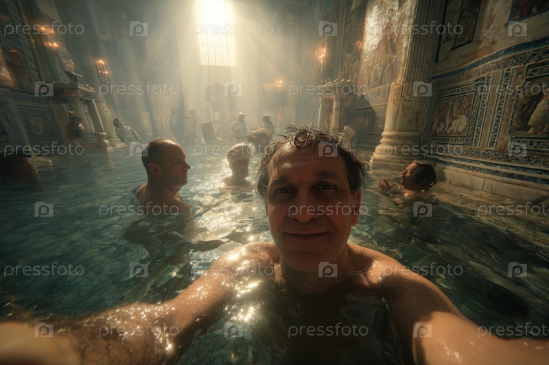 Портрет мужчины среднего возраста, делающего селфи в древней бане