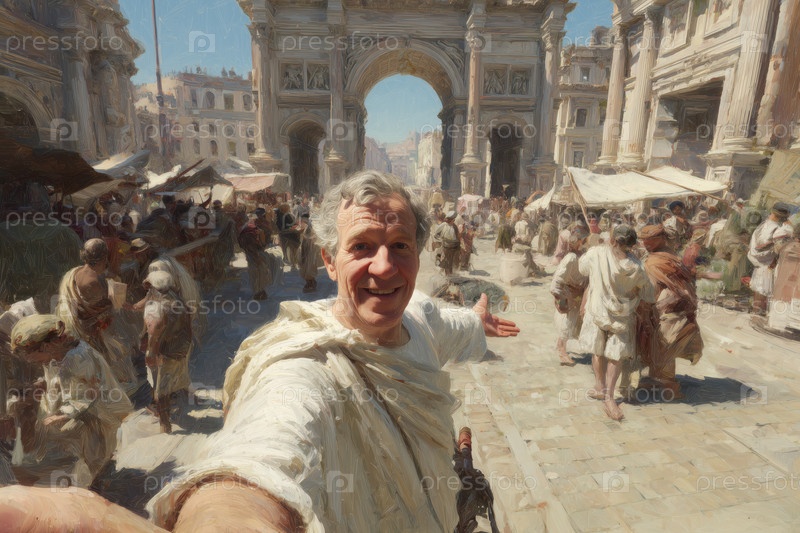 Портрет мужчины средних лет, делающего селфи на древнеримском рынке