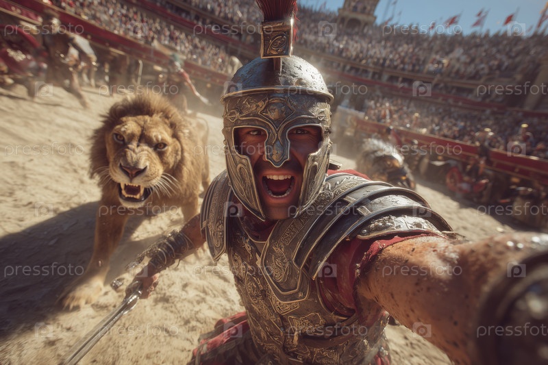 Портрет молодого взрослого мужчины, делающего селфи Борьба с львом в арене
