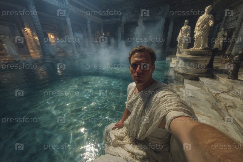 Портрет молодого взрослого мужчины, делающего селфи в древней римской бане
