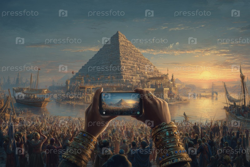 Женщина фотографирует сцену древней пирамиды со смартфоном на закате