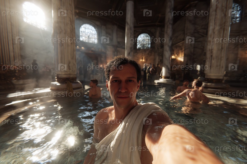 Портрет молодого взрослого мужчины, отдыхающего в древней мраморной бане