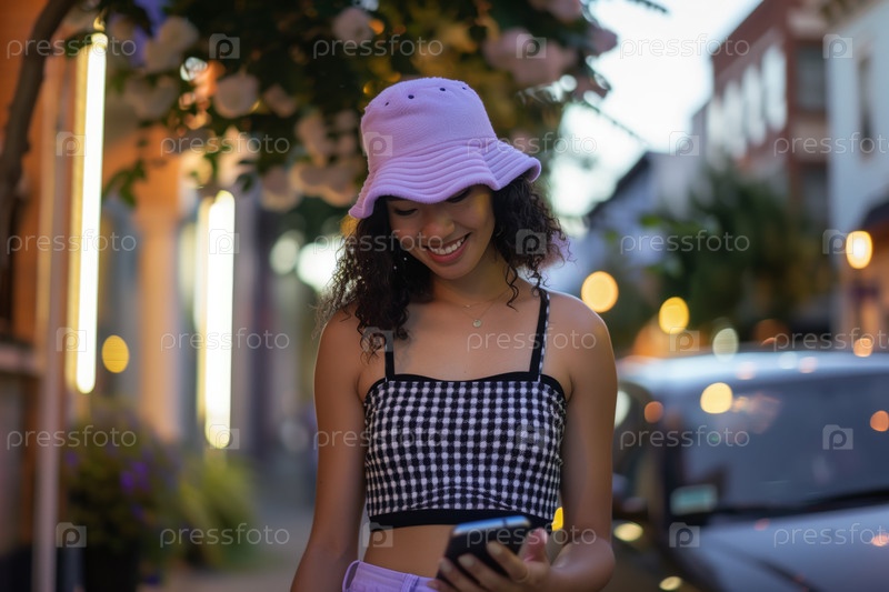 Портрет улыбающейся девочки-подростка, использующей смартфон на открытом воздухе