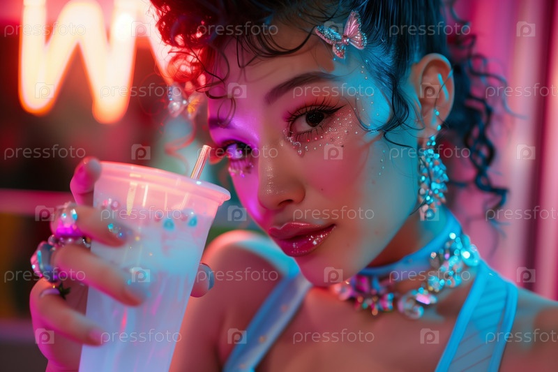 Портрет азиатской девочки-подростка, пьющей напитки и выражающей стиль поколения Z