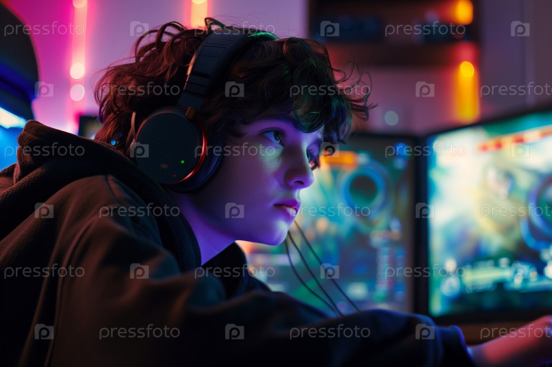 Teenage Boy Gaming на компьютере в неоновой комнате, представляющей культуру поколения Z