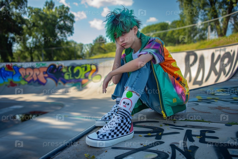 Мальчик-подросток, сидящий в скейтпарке и выражающий городское отношение поколения Z