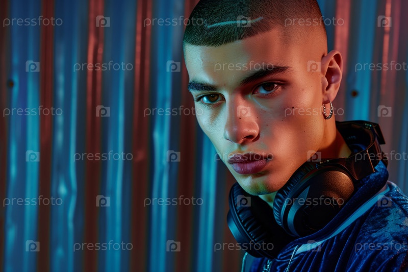 Портрет подросткового мальчика, носящего наушники и выражающего уверенность